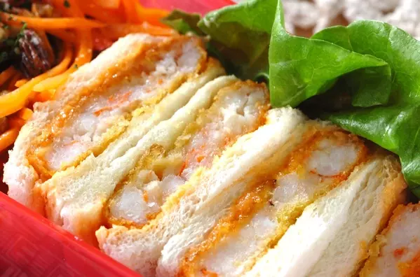 3 レタスはよく洗い、パンにはさめる大きさにちぎる。 キッチンペーパーなどで、水分を取っておく。 4 食パンをきつね色になるまで焼き、内側になる部分にバター、からし(お好みで)を塗る。 5 平たい皿に「特級とんかつソース」を出し、とんかつ 熱いうちに両面にトンカツソースをからめる。 2 食パンの片面に<マヨソース>をぬり、2枚にキャベツ、 (1)のチキンカツをのせ、<マヨソース>をぬった方を下にして残りの食パンでサンドする。 3 ラップでしっかり包んで少し置き、半分に切って器に